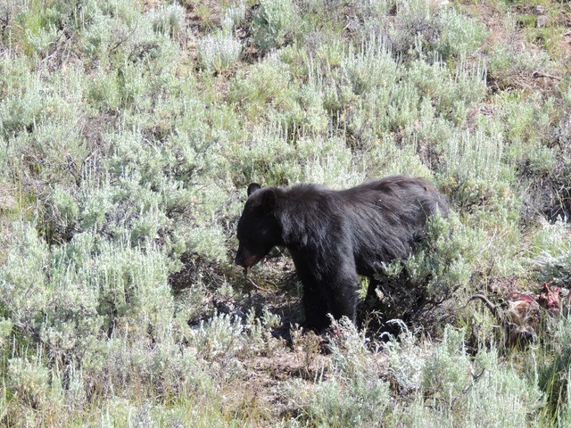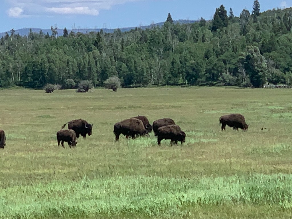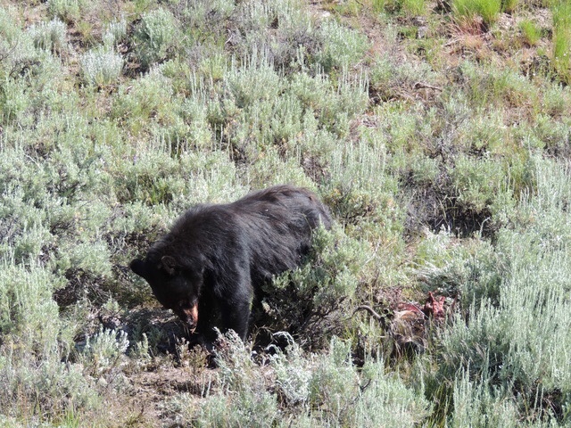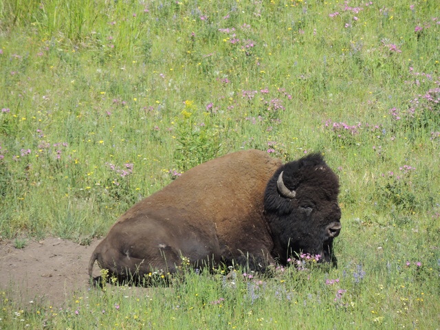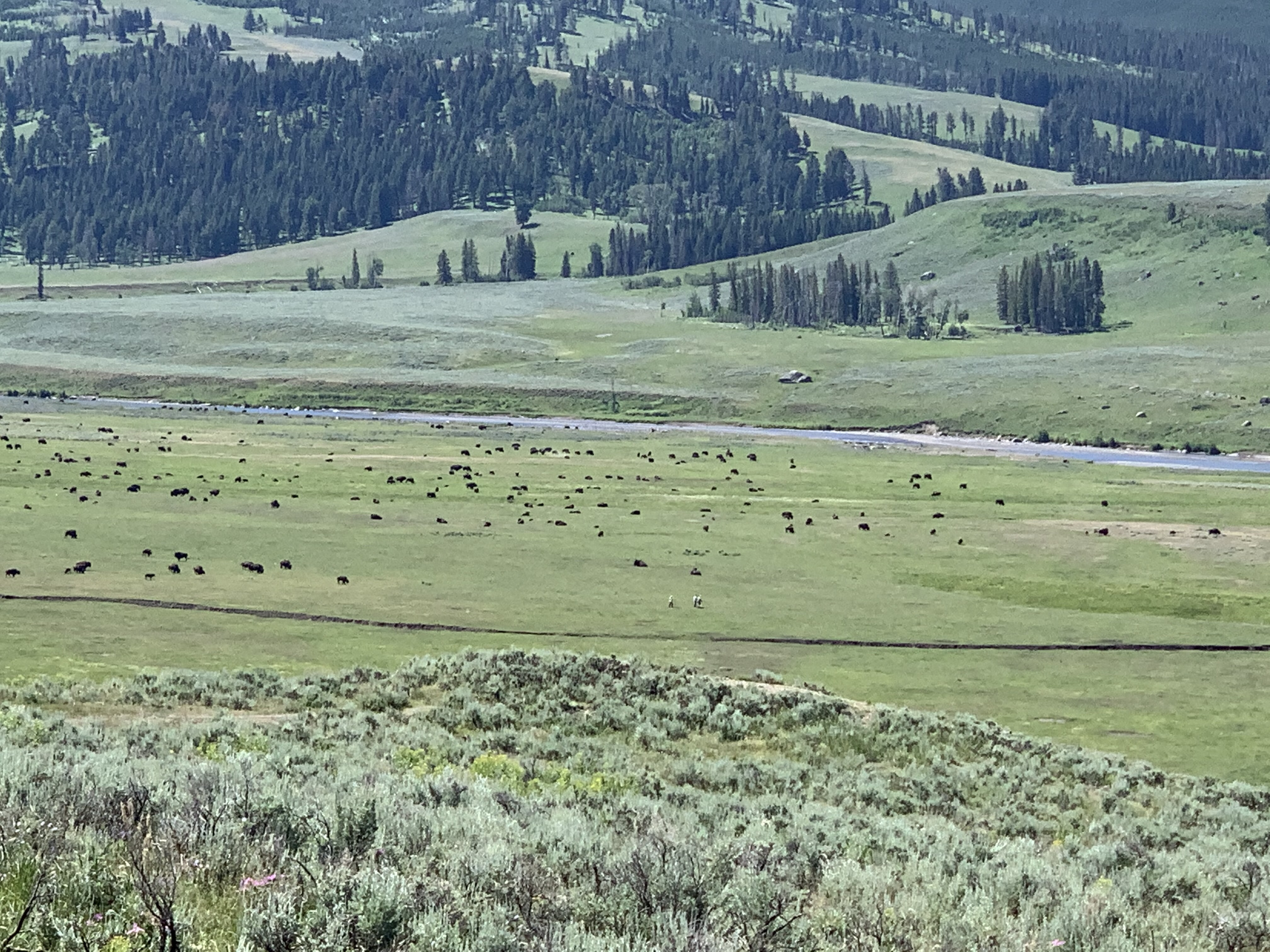 Best of the day; thousand of bison on the river bank, multiple pronghorn sheep, and our first bear sighting. He was actually close to the road feasting on a dead animal, couldn’t get close enough to see what it was but I know someone could have told us.