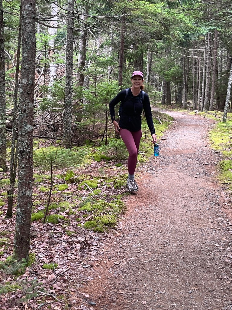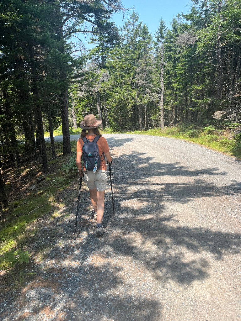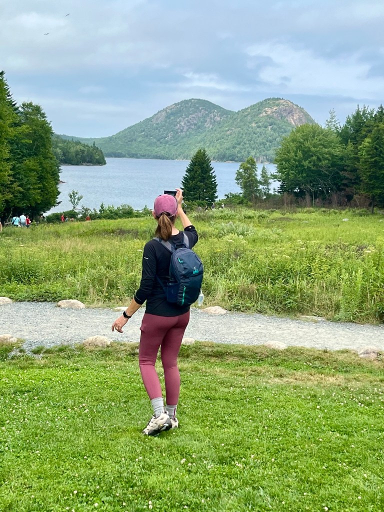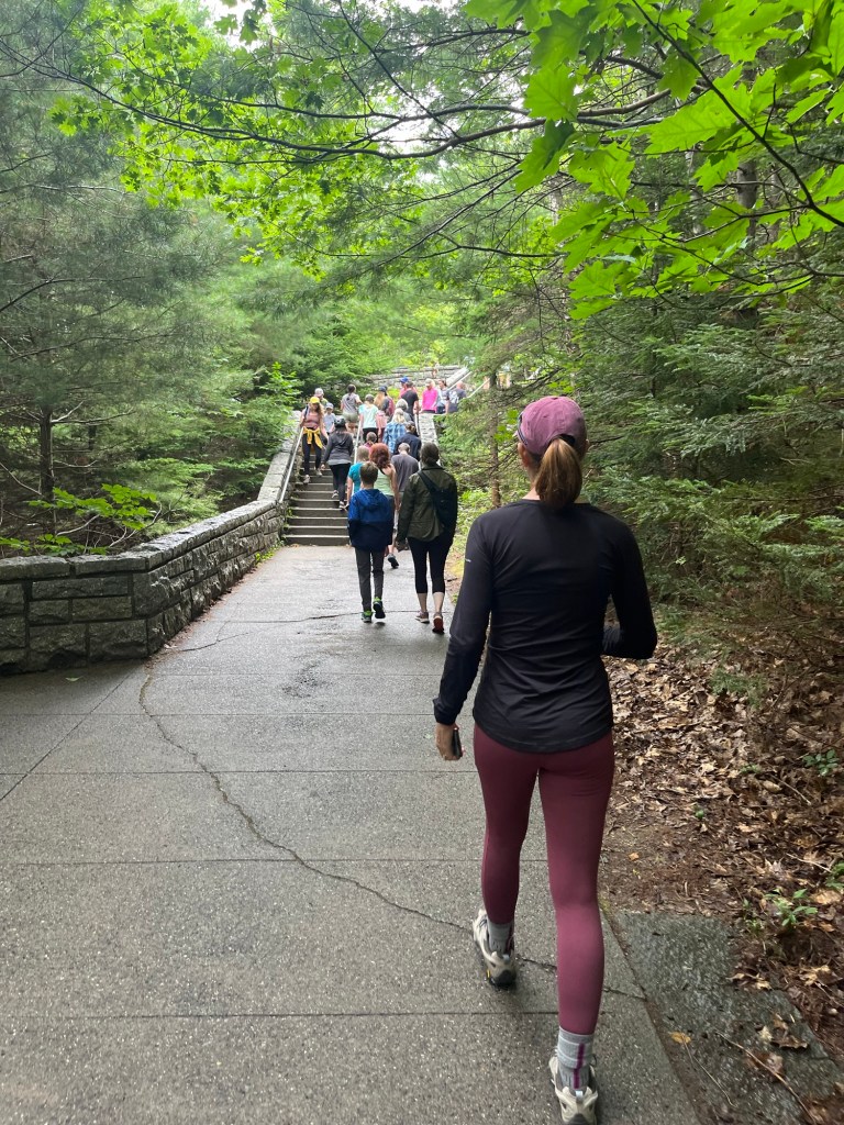 We parked at Brown Mountain Gatehouse and hiked the carriage paths to see Jordan Pond. The carriage paths were built by John D. Rockefeller so he and his buddies had a place to travel on carriages to get away from the hustle bustle of loud cars. Now it is primarily used for hikers and bikers…mainly bikers on electric bikes (at least they are half way trying!)